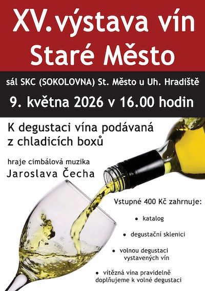 Zveme vás na 14. ročník Výstavy vín ve Starém Městě, která se koná 10. května 2025 od 16 hodin. Těšíme se na vás.